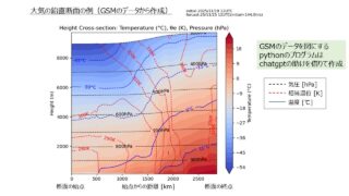 ChatGPTに助けてもらいGSMのデータから大気の鉛直断面図をpythonで作成できるようにしました。ChatGPTで9割がた作ってくれて,残りの1割くらいを自分で作ったり間違いがないか検証することになったので,苦労がかなり低減されました。私の勉強にもなり大変強力なツールと感じました。また,これを使い冬型の気圧配置で特徴的な鉛直断面図が得られたので紹介します。