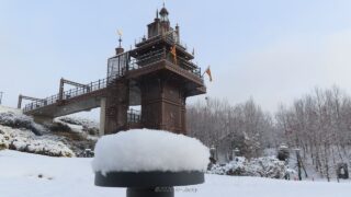 不思議な雪景色や氷を紹介します。切り株にできたドーナツ状の積雪,雪あられや雪の結晶,積雪にできた黒や白色の足跡,氷の中のカーブした気泡,表面に網目模様のある氷,しぶきでできた氷が色付いている,氷が動物のように見える,円柱状の氷が自然にできたようすなどです。
