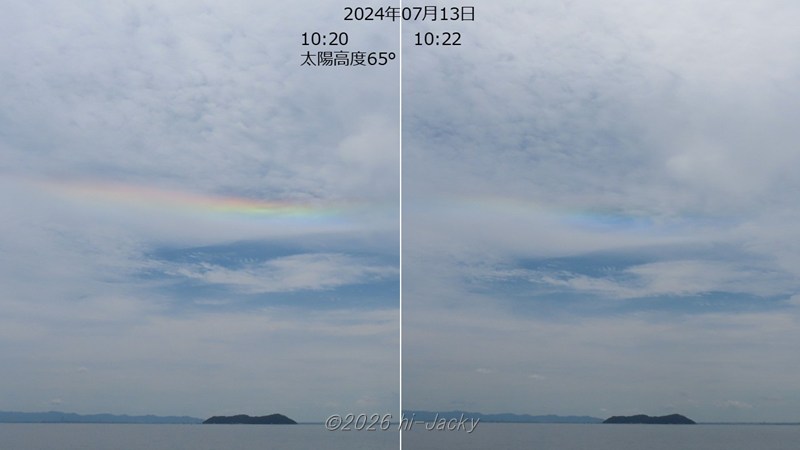 また,太陽高度が58°以上ないと環水平アークは現れないので,今回も各写真の太陽高度を示します。