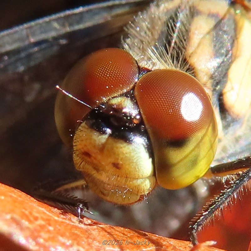トンボの眼は個眼がたくさん集まった複眼です。下の写真はヒメアカネのドアップです(2025年10月21日撮影)。眼の上側にピントが合って個眼の作る模様が見えます。