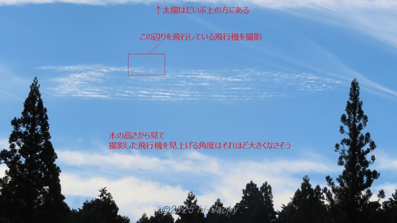 観測地点と飛行機の位置および高度差から,飛行機が見えているのが水平方向から何度の高さにあるか計算でき,その角度は12.7°でした。太陽高度は34°なので,太陽と飛行機の方向のなす角は21.3°となります。約22°ですが,この角度は内暈が見られる角度とほぼ同じです。内暈の可能性はないのでしょうか?