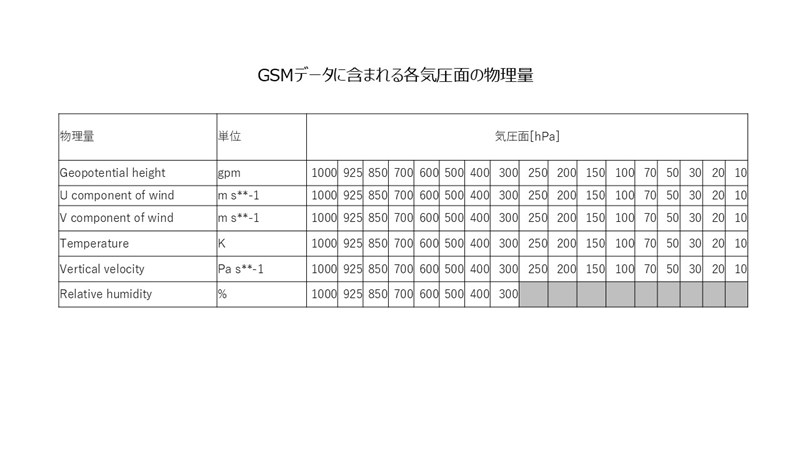 GSMのデータの形式は「grib2」で,Pythonでこのファイルから必要なデータを取り出すものとして「pygrib」というライブラリがあります。また,気象データの処理や計算を行うライブラリ「MetPy」も使います。