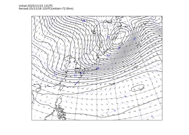 最初に掲載したのは海面更正気圧と850hPaにおける気温でした。最後に,500hPaにおける高度と気温を示します。気圧面と描画したい物理量を指定すれば,いろいろな天気図を描くことができます。今後は,より見やすい天気図を目指して改良していきます。また,いまはスパゲティコードですが,オブジェクト指向のプログラムにして見やすく改良しやすいコードにしていきたいと思います。皆さんにお知らせできるようなトピックができたらまた記事を掲載するつもりです。