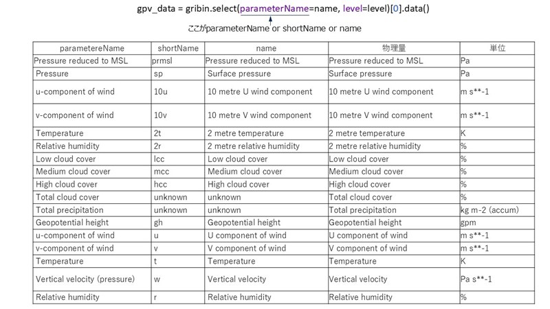 また,2.でpygribでデータを取り出すとき,どの物理量にするか指定する必要がありますが,その方法が3通りあります。”name”,”shortName”,”parametereName”です。一覧を下図に示します。ここを理解するのが大変でした。