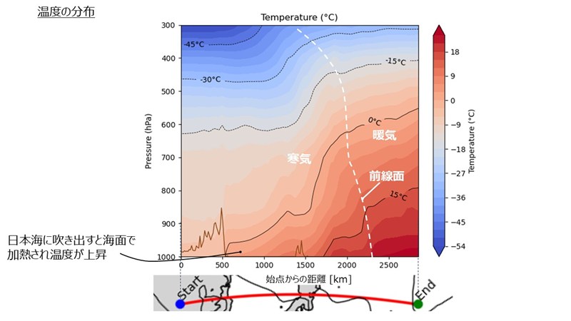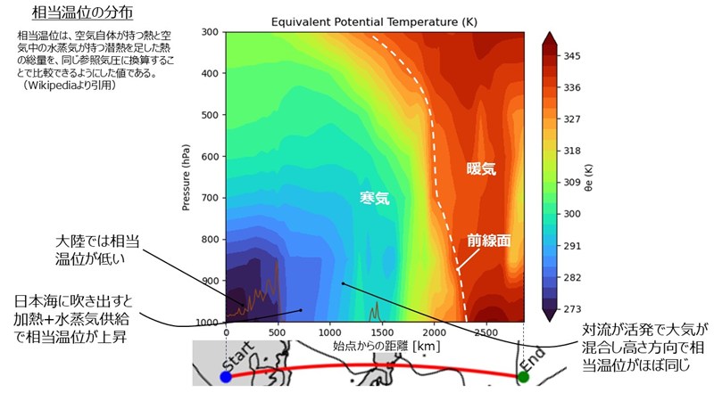 - ユーラシア大陸では相当温位が低いですが,日本海に吹き出すと空気が加熱されたり水蒸気が供給されたりして相当温位が上昇します(気団の変質)