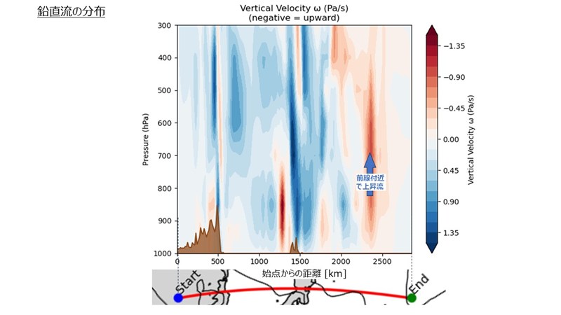 最後は鉛直流です。赤っぽいところは上昇流,青っぽいところは下降流となっています。前線付近では上昇流となっていることがわかります。