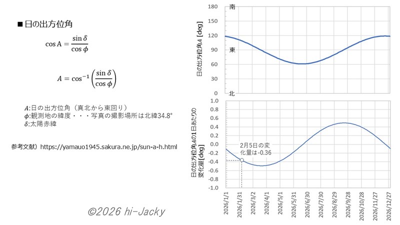 日の出方位を計算する式があるので,観測した値と計算値を比較しましょう。計算式と計算結果を以下に示します。日の出方位角は正弦波状に変化し,今回観測した2月5日あたりでの1日の変化量は北の方角に0.36°移動する計算となります。観測値との差は0.01°で,それなりの精度で観測できていることがわかりました。