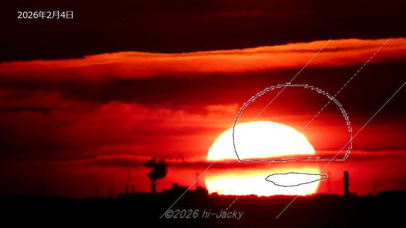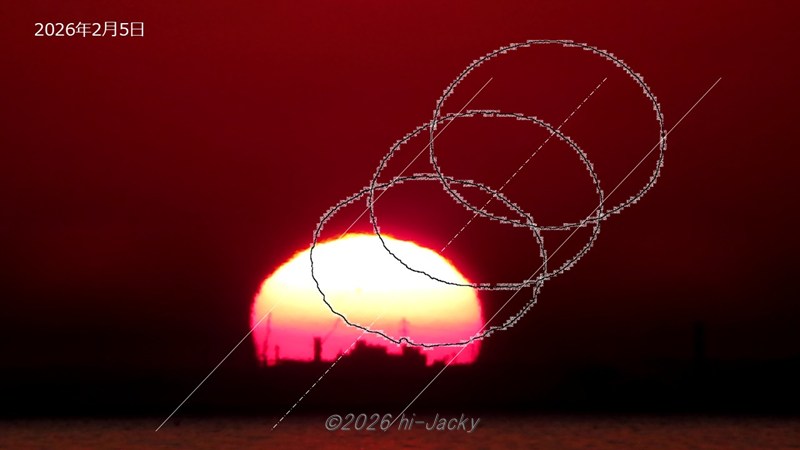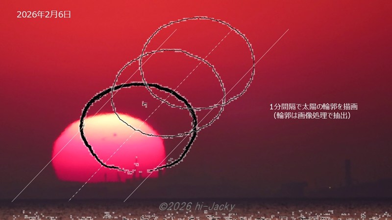 1. 日の出は写真ではなく動画で撮影し,そこから1分ごとのフレームを取り出して太陽の動きを追います。これにより,どの時刻を見ているのかの影響がなくなります。具体的には,1分ごとのフレームから画像解析ソフト「Image J」により太陽の輪郭を抽出し,背景色透明のGIFファイルを作成して重ねます。すると下の写真のように1分ごとの太陽の輪郭が並んだ絵が出来上がります。