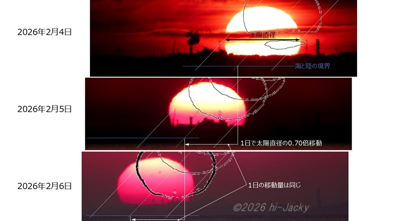下の図は補助線を描いたものを3日分並べたものです。これには,青実線で海と陸の境界が記載してあります。白破線と青実線の交点が日の出の方位です。日の出方位を比較すると1日あたりの変化量がわかり,それは太陽直径の0.70倍でした。太陽の視直径は約0.53°なので1日の日の出方位の変化量は0.37°(=0.53×0.70)となります。
